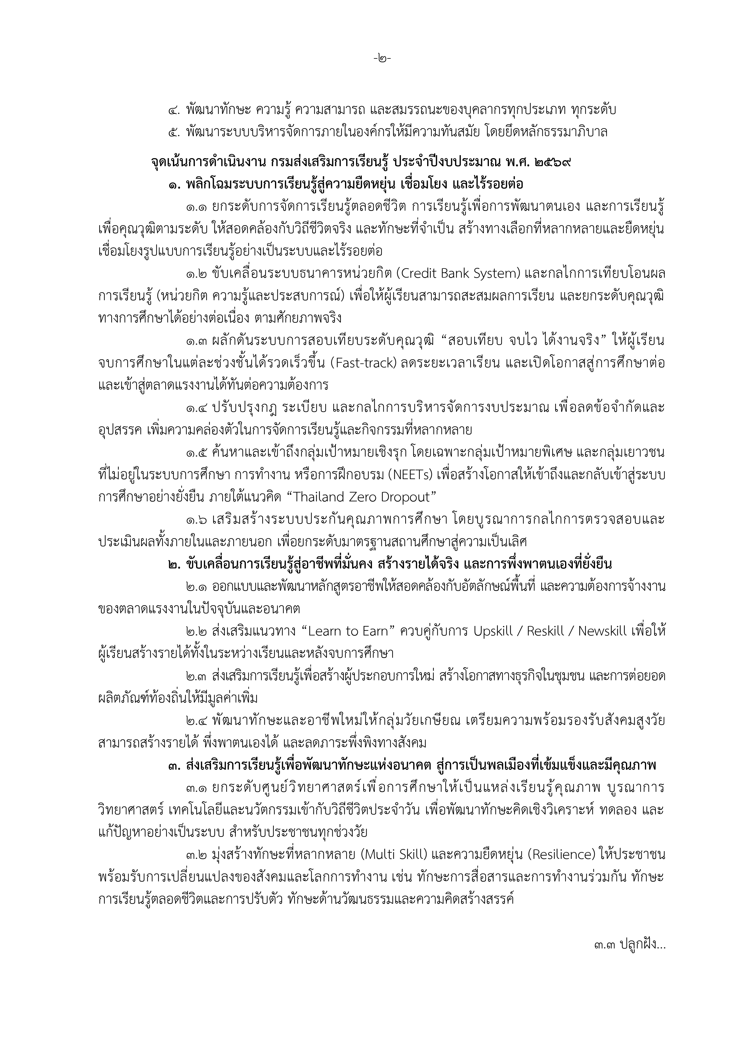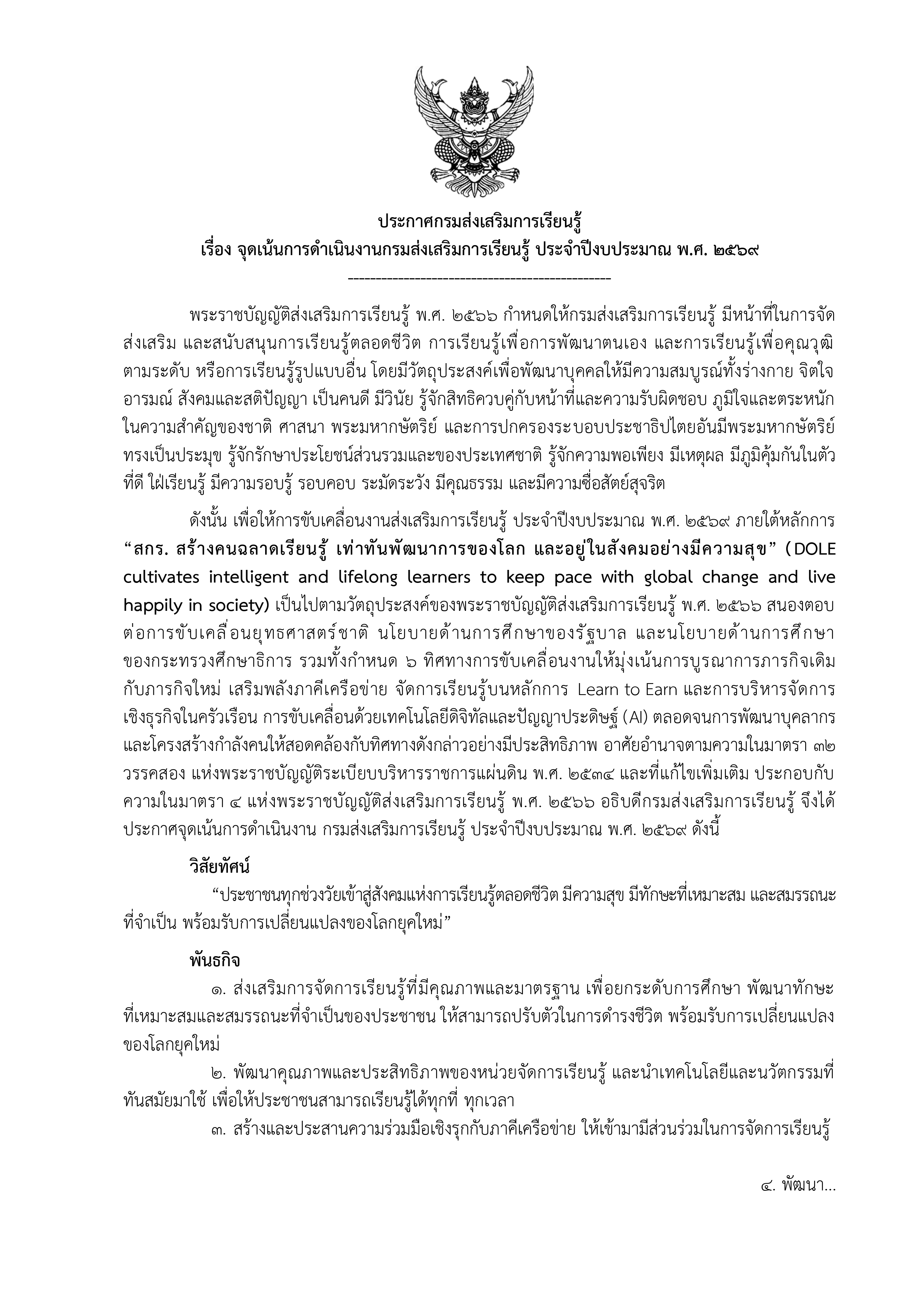 ประกาศกรมส่งเสริมการเรียนรู้ เรื่อง จุดเน้นการดำเนินงานกรมส่งเสริมการเรียนรู้ ประจำปีงบประมาณ พ.ศ. 2569